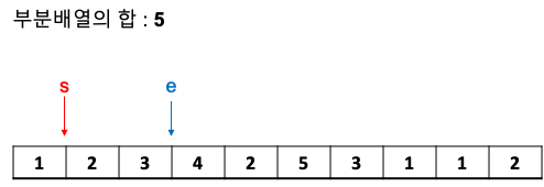 이제 부분배열의 합이 원하는 값 5가 되었습니다.